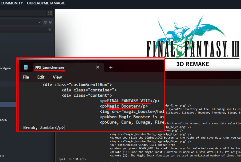 …when I was downloading and installing FFXI to a new system, I ran into an error. I don’t remember what it was, I just remember it took a long, annoying time to fix. FFXIII-2 and the FFIII 3-D remake had similar issues. I thought I’d have an easier time fixing the problem with the FFIII 3-D remake because it named a specific .dll file in its error message. The .dll file in question was related to Windows C++ runtime packages based on OS versions (32 or 64 bit, and whether or not one has an AMD processor? I think?). Now, this is where the screencap above comes into play. The PC version of the FFIII 3D remake (the launcher, at least, maybe more), was apparently built on the bones of the launcher of the Final Fantasy VIII Steam release. Basically, I was trying to find a work around for that missing .dll file before I finally got the issue fixed, and eventually I stumbled on a huge list of Final Fantasy VIII locations (255 to be exact, though some listings were blank), a tutorial for Chocobo World in several languages (with English in last, because the English speaking nations deserve these glorious games the least), and finally, what’s found in the screencap above with the “Magic Booster” info which is unique to the 2013 Steam release. That’s kinda where I stopped because I started to go cross-eyed.