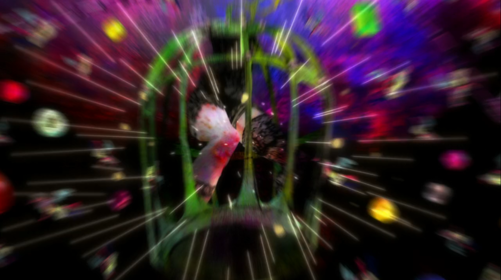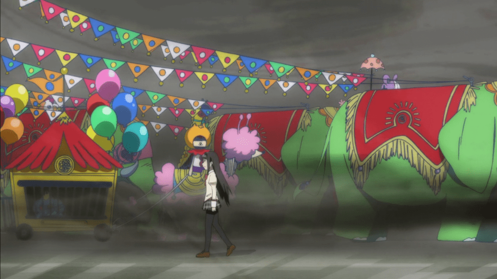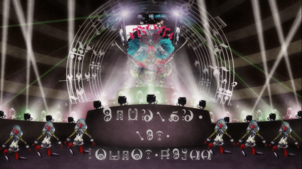 Sayaka made a wish and became a magical girl and showed up to save Madoka (and a suicidal cult) from the witch Kirsten. This is a witch that doesn’t play back her own memories (as we see with Octavia Von Seckendorff later). This is a witch that seems to open up the thoughts and memories of others. The wiki says that it’s supposed to be a snowglobe labyrinth (there are carousel/carnival ride motifs as well) – all images evocative of childhood – and there are a few interpretations I read into this. First, there’s a loss of innocence involved in Sayaka becoming a magical girl, as is shown in the destruction of this witch surrounded by this childhood imagery. Second, there’s a quote from TCMoS. It talks about “Awakening ‘the wonderful darkness after turning off the TV'” that comes to mind with this witch. Ironic, given that there’s a lot that could be said here for how much I’m writing about an anime in connection to a book about suicide given the timing of everything, but… this is what my brain does. I stare into abysses, because I barely watch TV. When I do… it’s stuff that I can unpack like this.