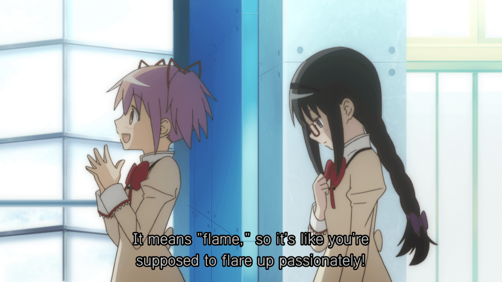 Also, the name Homura might mean “passion” or “flame”. While Akemi, roughly translated, can mean “bright mindset” or “dawn beauty”. Which makes sense, because she is very passionate about her wish. She starts off with a bright hope. It never becomes a curse over the course of the first two films. Also, her story starts again and again on the morning of the 16th of (possibly) March 2011. Like I said: layered. Not subtle.