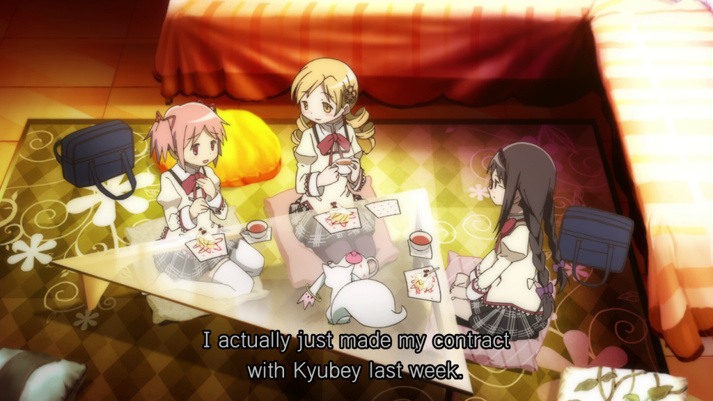 In Sailor Moon, there’s Usagi Tsukino, a middle schooler who gets awakened as a Sailor Scout by Luna, a talking cat. Usagi Tsukino becomes Sailor Moon when there’s trouble. She works alongside the other Sailor Scouts and they announce that they fight for love and justice as the pretty sailor-suited soldiers, and they’ll punish you in the name of the moon. The inversion in Madoka Magica in terms of the staples of the magical girl genre set forth by Sailor Moon, is that teamwork is generally to the detriment of the magical girls. And we don’t see Madoka Kaname AS a magical girl in the context of the story until about halfway through the 2nd movie. Whereas in Sailor Moon, we see the title character in the first episode as she navigates her newfound role as the reincarnated Queen Serenity (Sailor Moon is actually way cooler than the “western” fan base gives it credit for).