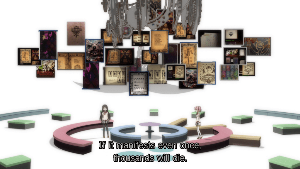 Above, we see Patricia, the “class representative” witch. She doesn’t really DO anything on her own, but rather simply sends mindless minions to fight in her stead. When Homura wakes up in this timeline, she realizes that she didn’t just wake up from a dream, she has a soul gem. She is a magical girl. When she gets to class, she excitedly shows her exceptional lack of op-sec skills and immediately tells Madoka (and the rest of the class) how great it is that they get to be magical girls together!